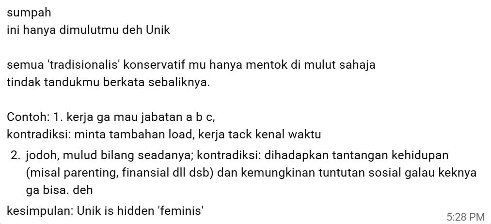 narasi di atas, time line nya salah, dan mixed values aka berantakan ,, jadinya ga bener. BUT ,,, its OK kok ,, . Se 45 taon gw idup ,,, sangaaaaaaaaaaaattttt jarang orang mengerti gw sik ,, . KENAPA yk ??? wkkwkwkkwkw ,, . Gw lebih sering meng-IYA kan ,, apa yg orang pikir ttg gw ,,, . Karenaaaaaaaaa ,,, ga ngaruh ma gw juga sik ,, . i am who i am ,, . Jelas gw yg lebih tau diri gw ,,, . Orang mo maxa gw as dian sastro ,, ga bisa kan ?? gw tetep hafikuw ,,, wkkwkwkkwkwkwkk ,,,