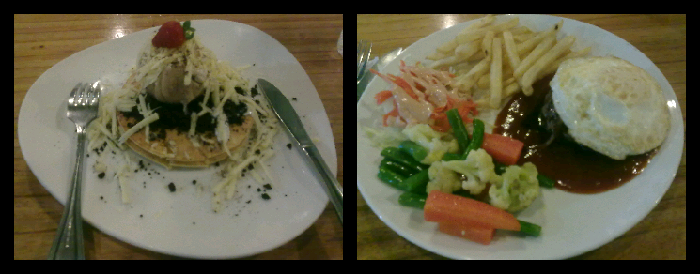 Next … got something to eat at mr.pancake. This cafe, quite gooooddd … they have delicious pancake … i luv it !!! Western food … steak, salad, and burger were available here. And it taste were delicious … . Of course, it serving still too much for me … . Buuuuttt … still on my motto :: (pun) ga doyan, kalo ada depan mata, kudu d abisin !!! Ga boleh buang makanan. Haahaahaaaa .